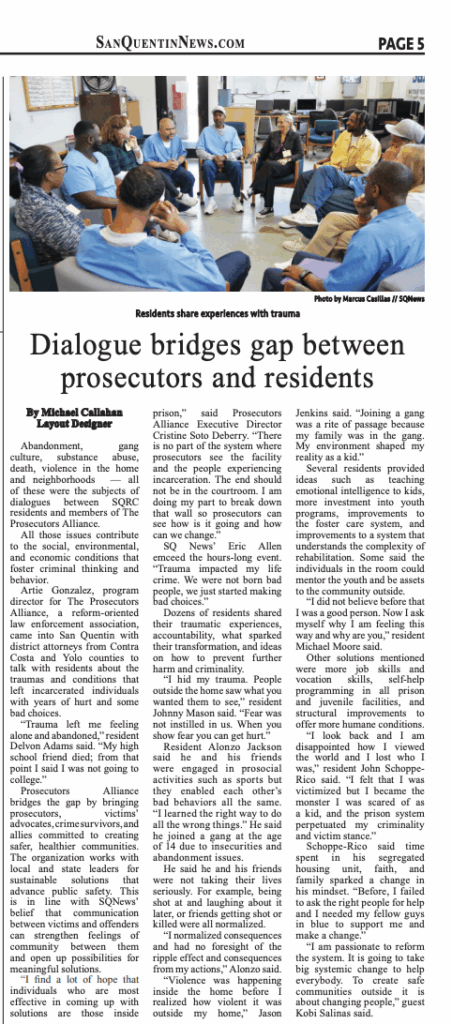 Prosecutors Alliance bridges the gap by bringing prosecutors, victims’ advocates, crime survivors, and allies committed to creating safer, healthier communities. The organization works with local and state leaders for sustainable solutions that advance public safety. This is in line with SQNews’ belief that communication between victims and offenders can strengthen feelings of community between them and open up possibilities for meaningful solutions.